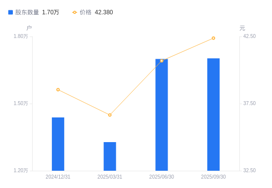 近一年(2024年9月30日至2025年9月30日),陕西华达A股股东户数从1.37万户,增加至1.7万户,增幅23.90%,区间股价上涨31.55%。