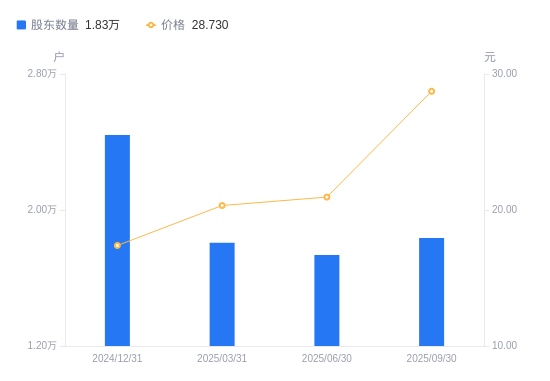 近一年(2024年9月30日至2025年9月30日),杭叉集团A股股东户数从1.54万户,增加至1.83万户,增幅19.04%,区间股价上涨44.74%。