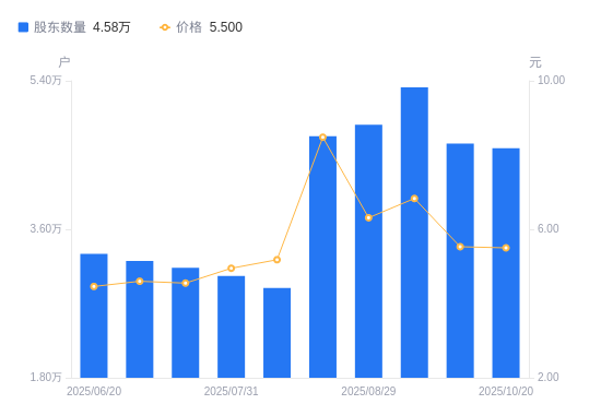 近一年(2024年10月31日至2025年10月20日),电子城A股股东户数从4.17万户,增加至4.58万户,增幅10.03%,区间股价上涨0.55%。
