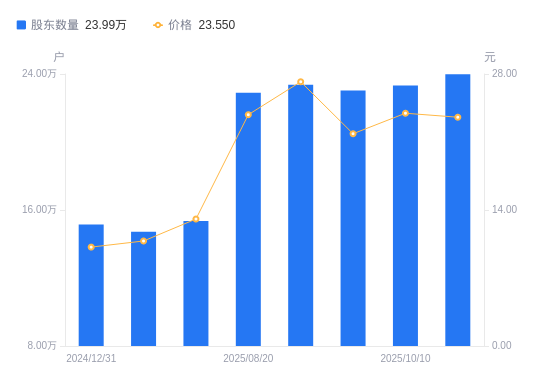 近一年(2024年12月31日至2025年10月20日),盛和资源A股股东户数从15.15万户,增加至23.99万户,增幅58.38%,区间股价上涨123.01%。