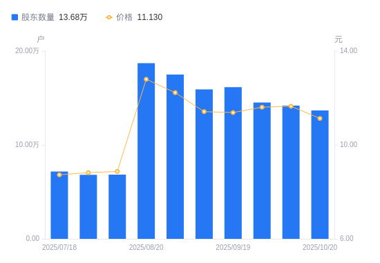 近一年(2024年10月10日至2025年10月10日),长城证券A股股东户数从8.94万户,增加至14.19万户,增幅58.73%,区间股价上涨29.88%。