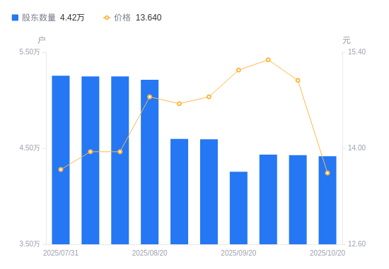 近一年(2024年10月31日至2025年10月20日),万安科技A股股东户数从5.7万户,减低至4.42万户,降幅22.43%,区间股价下跌5.01%。
