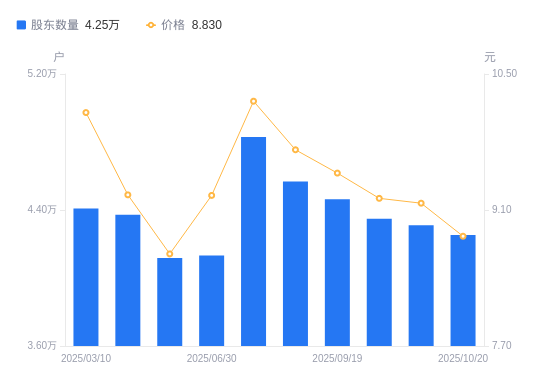 近一年(2024年11月20日至2025年10月20日),福蓉科技A股股东户数从4.97万户,减低至4.25万户,降幅14.39%,区间股价下跌17.51%。