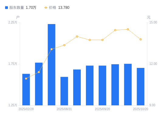 近一年(2024年12月31日至2025年10月20日),金徽股份A股股东户数从1.68万户,增加至1.7万户,增幅1.12%,区间股价上涨24.14%。