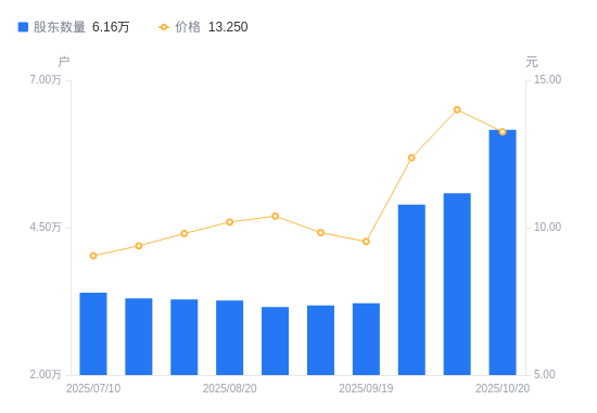 近一年(2024年10月31日至2025年10月20日),中山公用A股股东户数从3.76万户,增加至6.16万户,增幅63.85%,区间股价上涨62.58%。