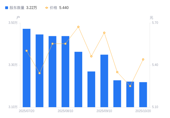 近一年(2024年11月20日至2025年10月20日),鹏鹞环保A股股东户数从3.51万户,减低至3.22万户,降幅8.27%,区间股价上涨5.96%。