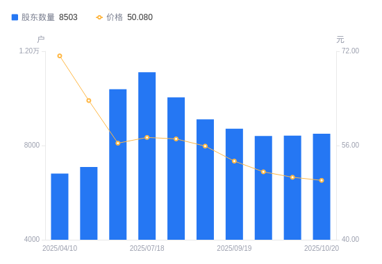 近一年(2024年10月18日至2025年10月10日),趣睡科技A股股东户数从5403户,增加至8417户,增幅55.78%,区间股价上涨46.16%。