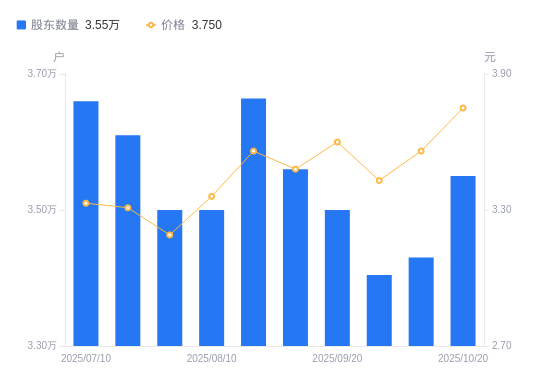 近一年(2024年11月30日至2025年10月20日),云维股份A股股东户数从3.3万户,增加至3.55万户,增幅7.58%,区间股价上涨1.08%。