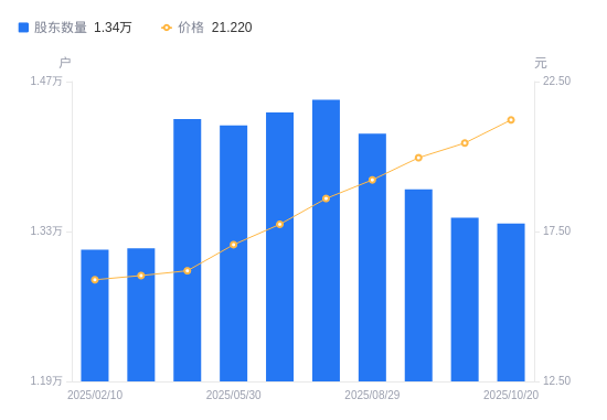 近一年(2024年10月31日至2025年10月20日),丽臣实业A股股东户数从1.35万户,减低至1.34万户,降幅0.90%,区间股价上涨38.97%。