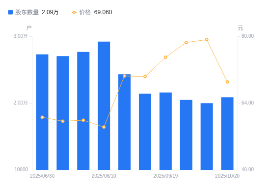 近一年(2024年10月31日至2025年10月20日),精测电子A股股东户数从2.57万户,减低至2.09万户,降幅18.86%,区间股价上涨14.68%。