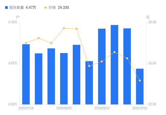 近一年(2024年10月31日至2025年10月20日),彩讯股份A股股东户数从4.45万户,增加至4.47万户,增幅0.46%,区间股价上涨13.75%。