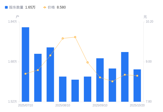 近一年(2024年10月31日至2025年10月20日),勘设股份A股股东户数从2.29万户,减低至1.65万户,降幅27.83%,区间股价上涨39.51%。