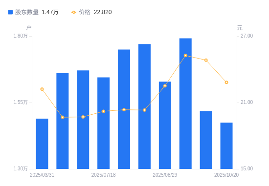 近一年(2024年12月10日至2025年10月20日),赛维时代A股股东户数从1.42万户,增加至1.47万户,增幅3.47%,区间股价下跌13.00%。