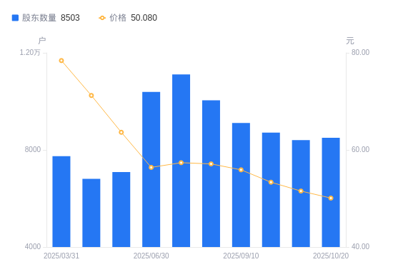 近一年(2024年10月31日至2025年10月20日),趣睡科技A股股东户数从5380户,增加至8503户,增幅58.05%,区间股价上涨43.72%。