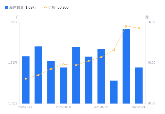 近一年(2024年9月30日至2025年9月30日),威尔高A股股东户数从1.53万户,增加至1.69万户,增幅10.50%,区间股价上涨106.37%。