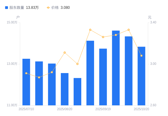 近一年(2024年10月31日至2025年10月20日),奥特佳A股股东户数从13.1万户,增加至13.83万户,增幅5.57%,区间股价上涨8.57%。
