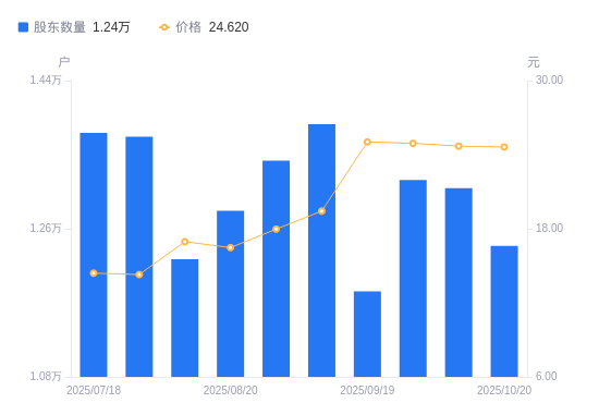 近一年(2024年10月31日至2025年10月20日),杭州高新A股股东户数从8496户,增加至1.24万户,增幅45.86%,区间股价上涨154.87%。