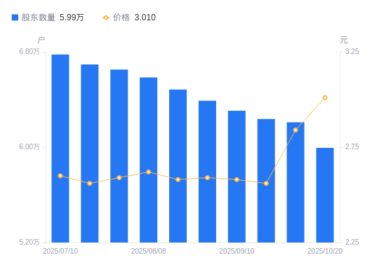 近一年(2024年10月31日至2025年10月20日),ST华闻A股股东户数从12.85万户,减低至5.99万户,降幅53.37%,区间股价上涨19.44%。