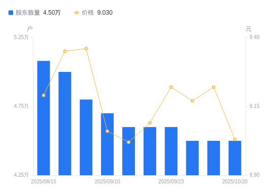 近一年(2024年10月10日至2025年10月10日),荃银高科A股股东户数从4.16万户,增加至4.5万户,增幅8.17%,区间股价上涨21.96%。