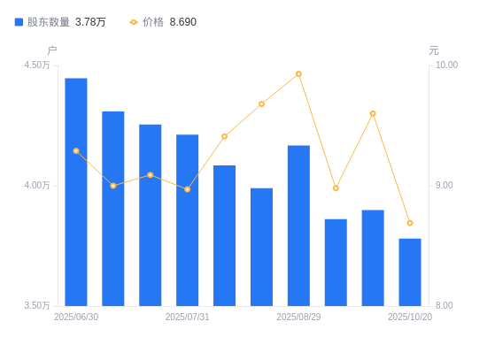 近一年(2024年11月8日至2025年10月20日),光韵达A股股东户数从5.38万户,减低至3.78万户,降幅29.74%,区间股价下跌14.55%。