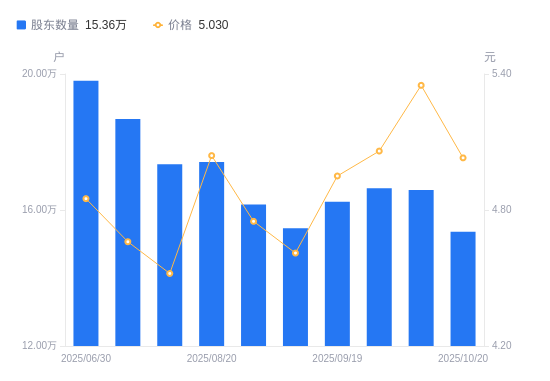 近一年(2024年11月29日至2025年10月20日),中超控股A股股东户数从7.74万户,增加至15.36万户,增幅98.41%,区间股价上涨85.61%。