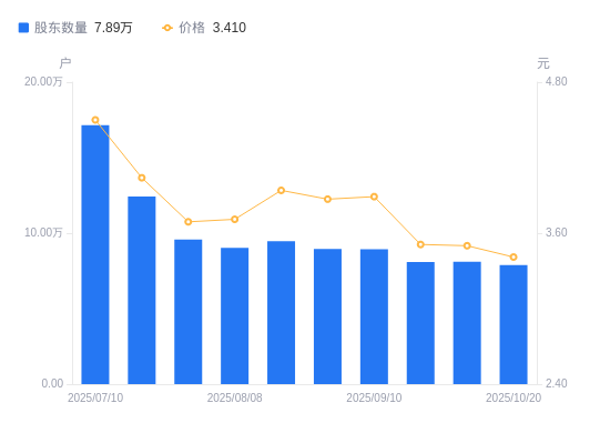 近一年(2024年10月31日至2025年10月20日),金一文化A股股东户数从2.18万户,增加至7.89万户,增幅262.24%,区间股价上涨5.90%。