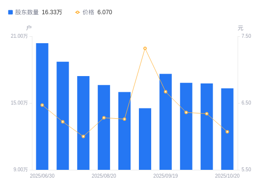 10月22日消息,数据显示,截至2025年10月20日,二六三A股股东总户数为16.33万户,较上期(2025年10月10日)减少4347户,降幅2.59%。公司最新A股总股本为13.75亿股,其中流通A股13.67亿股,户均持有流通A股数量为8372.28股,较上期增加217.14股,增幅2.66%;户均持流通A股市值5.08万元,较上期减少883.87元,降幅1.71%。