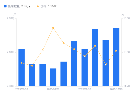 近一年(2024年10月31日至2025年10月20日),江苏神通A股股东户数从1.9万户,增加至2.82万户,增幅48.49%,区间股价上涨6.80%。