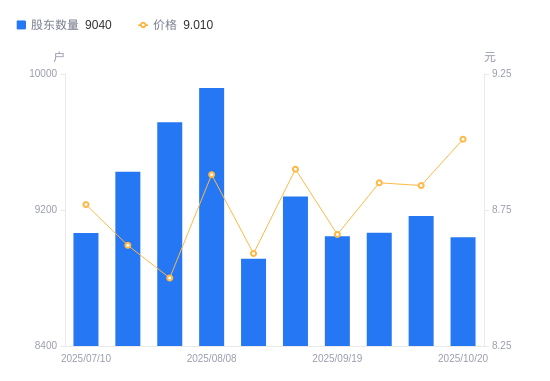 近一年(2024年12月31日至2025年10月20日),顶固集创A股股东户数从9937户,减低至9040户,降幅9.03%,区间股价上涨42.34%。