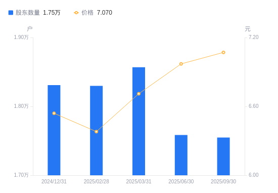 近一年(2024年9月30日至2025年9月30日),航民股份A股股东户数从1.71万户,增加至1.75万户,增幅2.50%,区间股价下跌0.70%。