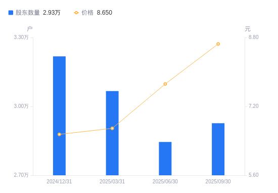 近一年(2024年9月30日至2025年9月30日),松芝股份A股股东户数从3.55万户,减低至2.93万户,降幅17.49%,区间股价上涨47.86%。