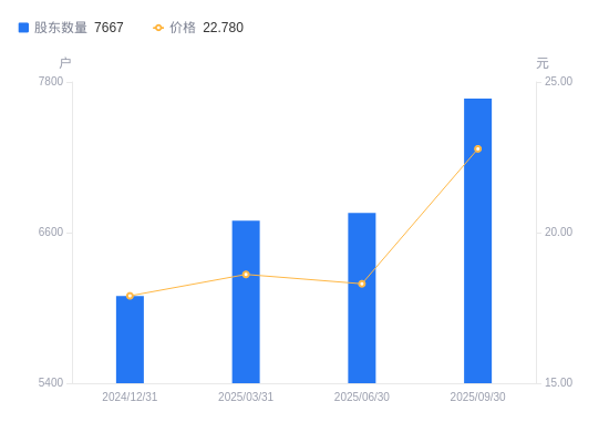 近一年(2024年9月30日至2025年9月30日),欧科亿A股股东户数从6030户,增加至7667户,增幅27.15%,区间股价上涨24.13%。