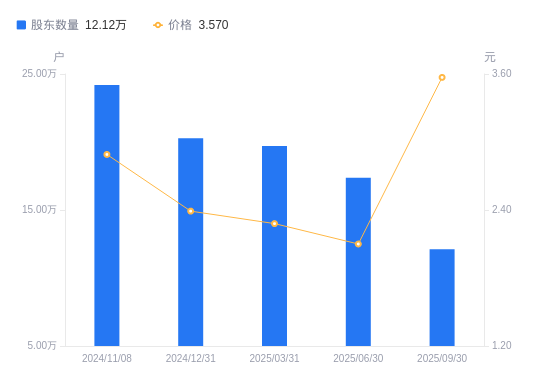 近一年(2024年9月30日至2025年9月30日),众泰汽车A股股东户数从18.87万户,减低至12.12万户,降幅35.75%,区间股价上涨98.33%。