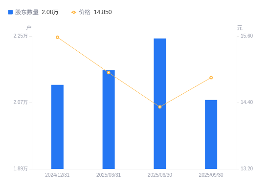 近一年(2024年9月30日至2025年9月30日),乐歌股份A股股东户数从1.97万户,增加至2.08万户,增幅5.49%,区间股价下跌2.37%。