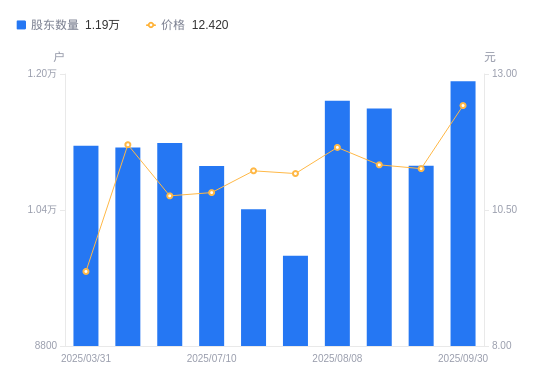 近一年(2024年9月30日至2025年9月30日),镇海股份A股股东户数从1.19万户,增加至1.19万户,增幅0.06%,区间股价上涨98.72%。