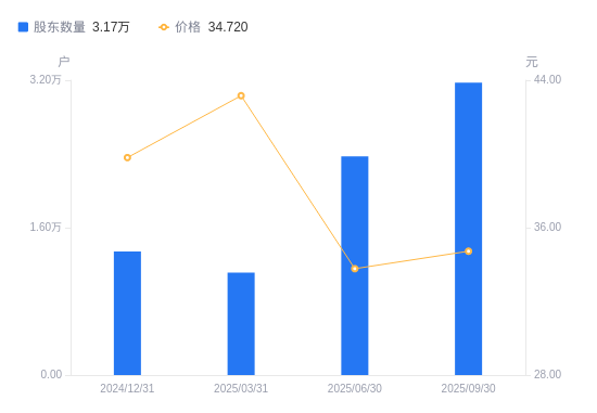 近一年(2024年9月30日至2025年9月30日),爱玛科技A股股东户数从2.17万户,增加至3.17万户,增幅46.47%,区间股价上涨1.97%。