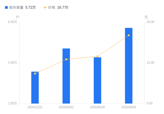 近一年(2024年9月30日至2025年9月30日),宜安科技A股股东户数从4.01万户,增加至5.72万户,增幅42.65%,区间股价上涨173.26%。