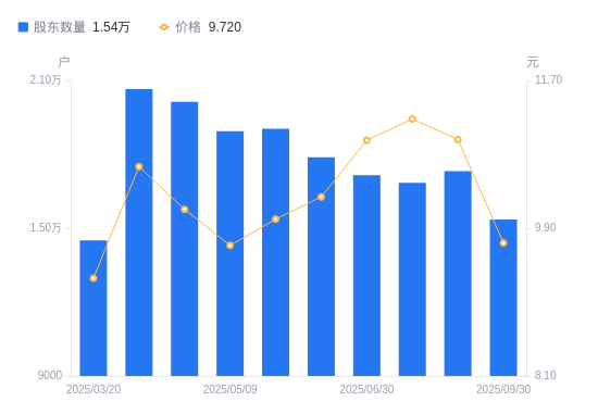 近一年(2024年9月30日至2025年9月30日),读客文化A股股东户数从1.69万户,减低至1.54万户,降幅9.21%,区间股价上涨5.19%。