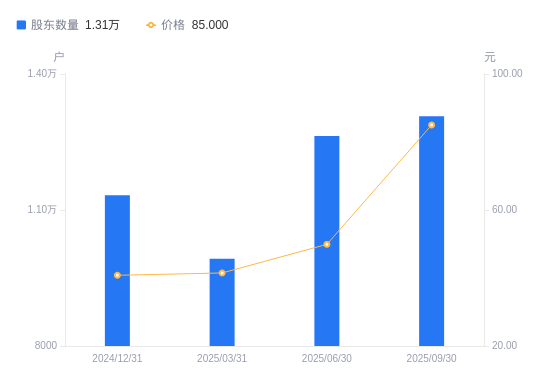 近一年(2024年9月30日至2025年9月30日),同飞股份A股股东户数从1.51万户,减低至1.31万户,降幅13.28%,区间股价上涨168.05%。