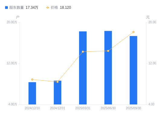 近一年(2024年9月30日至2025年9月30日),万马股份A股股东户数从8.33万户,增加至17.34万户,增幅108.17%,区间股价上涨143.88%。