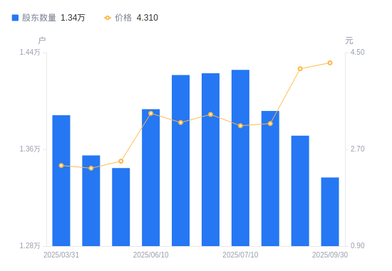 10月23日消息,数据显示,截至2025年9月30日,ST中迪(维权)A股股东总户数为1.34万户,较上期(2025年8月31日)减少346户,降幅2.52%。公司最新A股总股本为2.99亿股,其中流通A股2.91亿股,户均持有流通A股数量为2.18万股,较上期增加549.4股,增幅2.59%;户均持流通A股市值9.38万元,较上期增加4702.67元,增幅5.28%。
