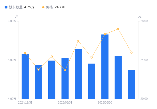 10月23日消息,数据显示,截至2025年9月30日,三角防务A股股东总户数为4.75万户,较上期(2025年8月20日)减少3550户,降幅6.96%。公司最新A股总股本为5.48亿股,其中流通A股5.32亿股,户均持有流通A股数量为1.12万股,较上期增加779.52股,增幅7.48%;户均持流通A股市值27.74万元,较上期减少6014.8元,降幅2.12%。