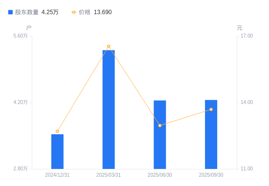 近一年(2024年9月30日至2025年9月30日),共达电声A股股东户数从3.79万户,增加至4.25万户,增幅12.33%,区间股价上涨32.66%。