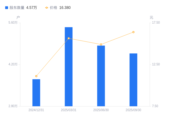 近一年(2024年9月30日至2025年9月30日),迪安诊断A股股东户数从3.95万户,增加至4.57万户,增幅15.79%,区间股价上涨40.29%。