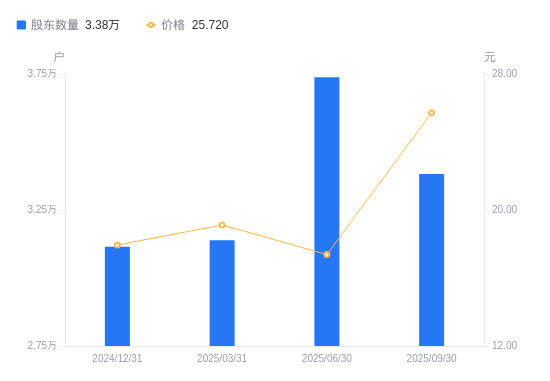 10月23日消息,数据显示,截至2025年9月30日,汉钟精机A股股东总户数为3.38万户,较上期(2025年6月30日)减少3551户,降幅9.50%。公司最新A股总股本为5.35亿股,其中流通A股5.34亿股,户均持有流通A股数量为1.58万股,较上期增加1498.65股,增幅10.50%;户均持流通A股市值40.57万元,较上期增加15.76万元,增幅63.52%。