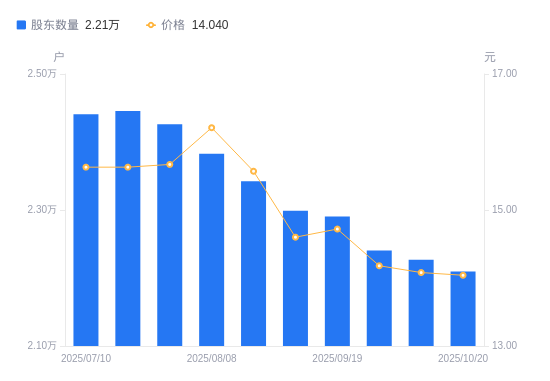 10月23日消息,数据显示,截至2025年9月30日,天邑股份A股股东总户数为2.24万户,较上期(2025年9月19日)减少503户,降幅2.20%。公司最新A股总股本为2.71亿股,其中流通A股2.18亿股,户均持有流通A股数量为9742.07股,较上期增加213.93股,增幅2.25%;户均持流通A股市值13.81万元,较上期减少2111.68元,降幅1.51%。