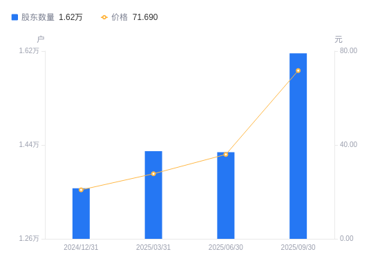 近一年(2024年9月30日至2025年9月30日),鼎泰高科A股股东户数从1.3万户,增加至1.62万户,增幅24.30%,区间股价上涨335.01%。