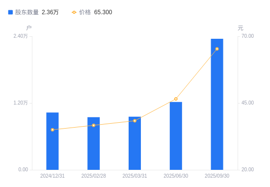 10月23日消息,数据显示,截至2025年9月30日,臻镭科技A股股东总户数为2.36万户,较上期(2025年6月30日)增加1.14万户,增幅93.15%。公司最新A股总股本为2.14亿股,其中流通A股2.14亿股,户均持有流通A股数量为9086.54股,较上期减少2739.61股,降幅23.17%;户均持流通A股市值59.34万元,较上期增加4.27万元,增幅7.76%。