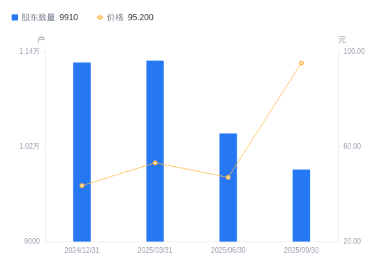 近一年(2024年9月30日至2025年9月30日),伟创电气A股股东户数从6806户,增加至9910户,增幅45.61%,区间股价上涨272.60%。