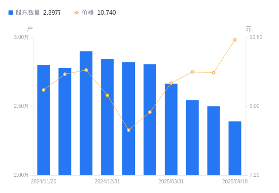 近一年(2024年9月30日至2025年9月30日),天润乳业A股股东户数从3.04万户,减低至2.37万户,降幅21.81%,区间股价上涨23.04%。